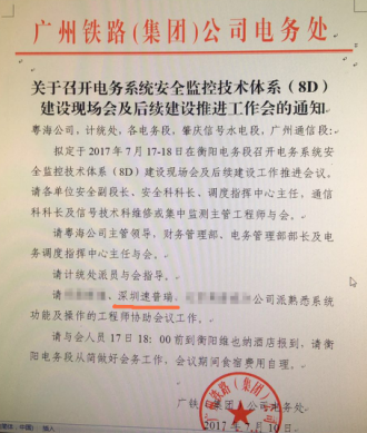 2017年7月18日,我公司接廣鐵集團電務(wù)處邀請參加在衡陽電務(wù)段舉辦的“電務(wù)系統(tǒng)安全監(jiān)測技術(shù)體系(8D)建設(shè)現(xiàn)場會及后續(xù)建設(shè)推進工作會議”。下稱“現(xiàn)場會”。